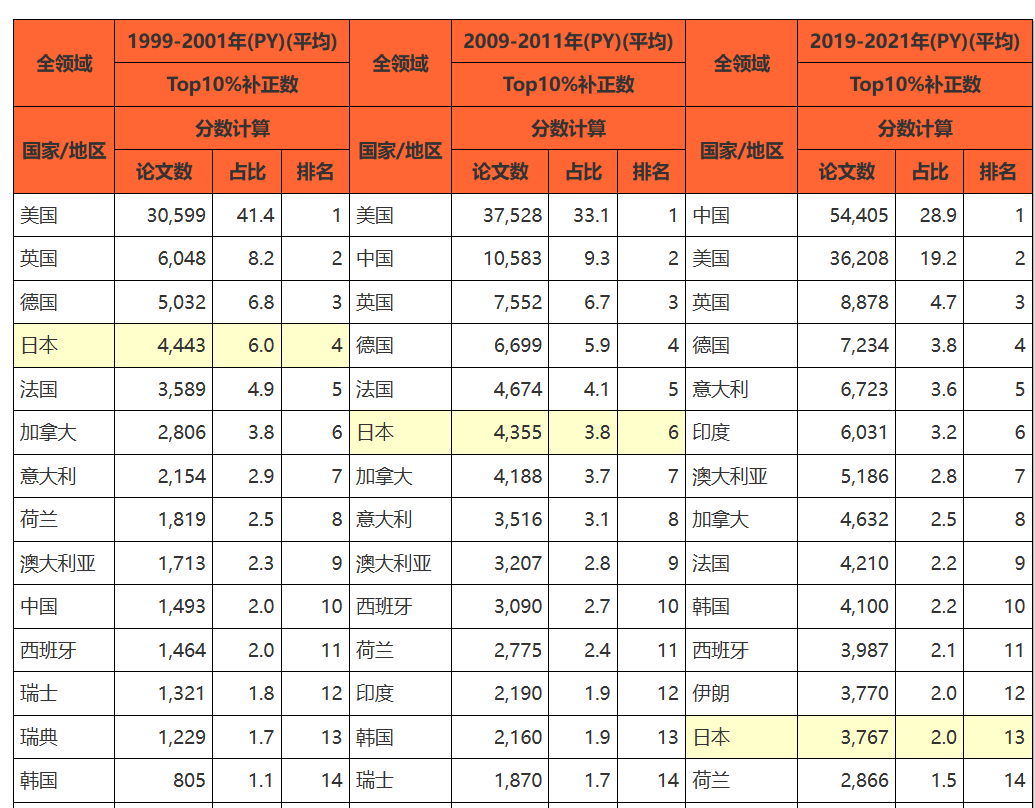 有意思的是,從這些排名變化也可以看出,日本為什麼會格外關注這個話題。因為不管是論文總量還是被引用論文的數量,日本的排名都在迅速下降,別説跟中美比較,日本在“受關注論文”方面甚至已經被伊朗超過。