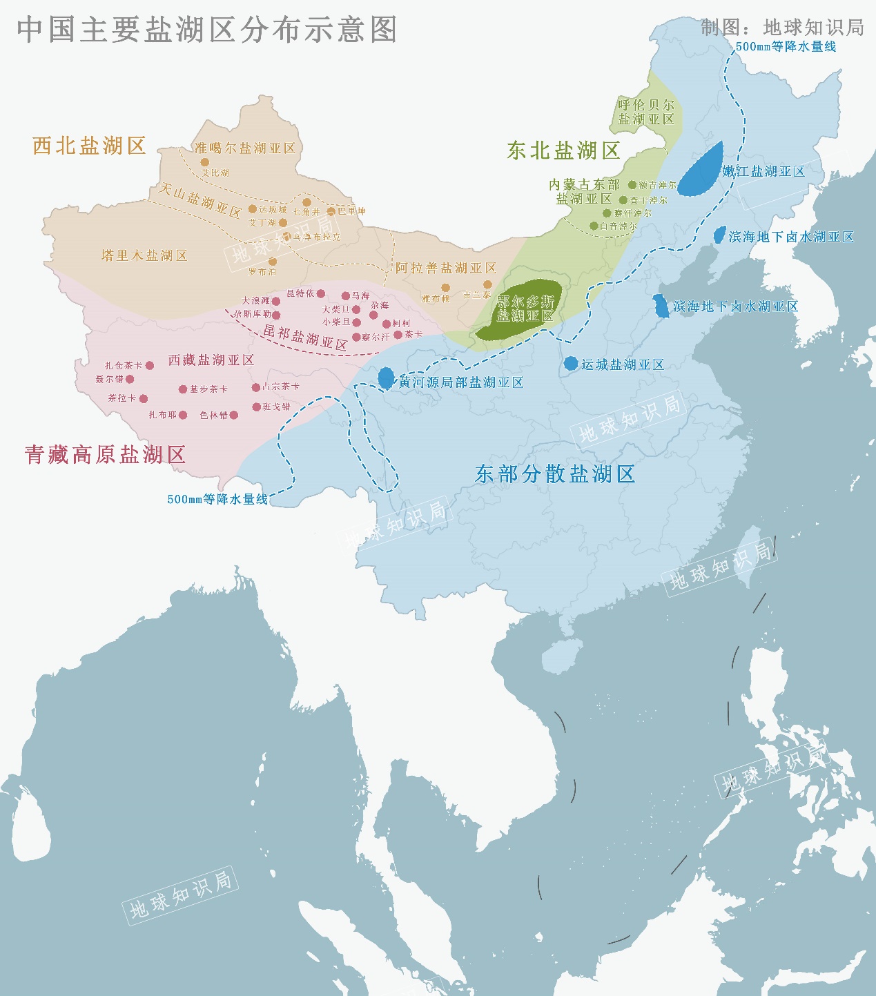 中國鹽湖的形成,主要受乾旱半乾旱氣候的控制,所以其邊界與500毫米降水量線,即亞乾旱與亞濕潤的界線大致吻合,含鹽地層均為第四系全新統。