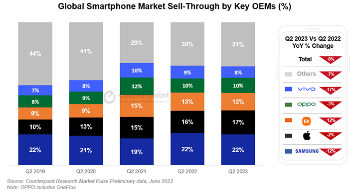 根據 Counterpoint 最新研究顯示,全球智能手機市場已經連續經歷了八個季度的下滑,今年全球智能手機出貨量甚至可能創十年新低。