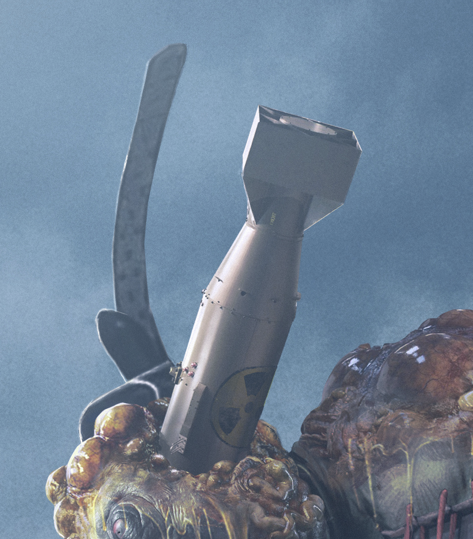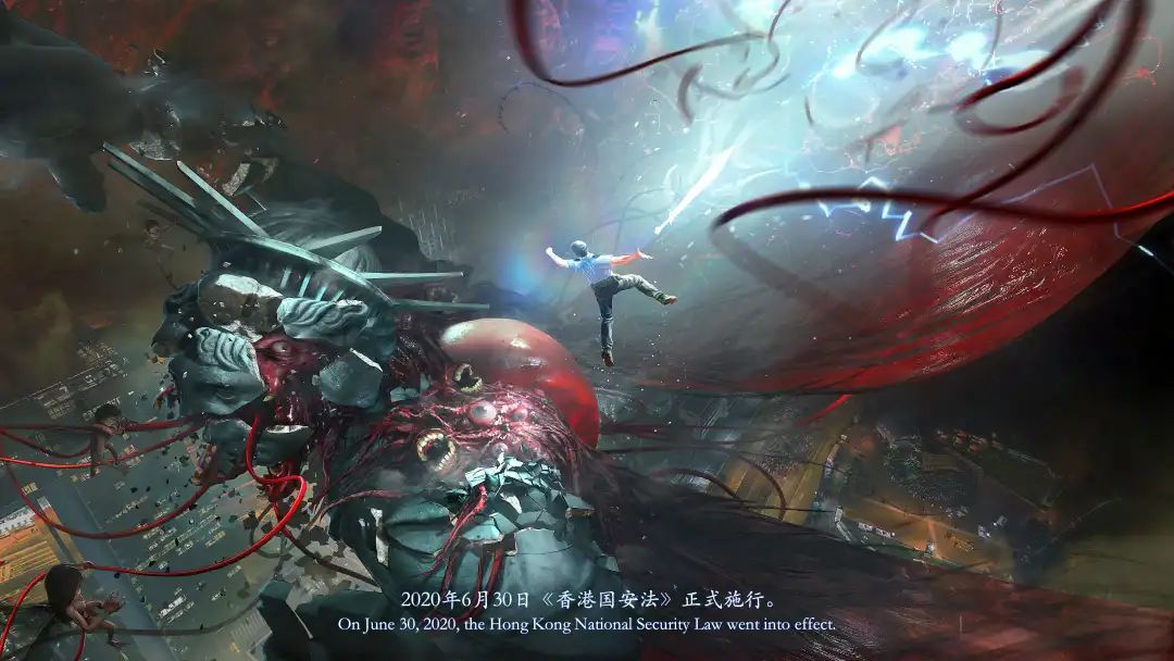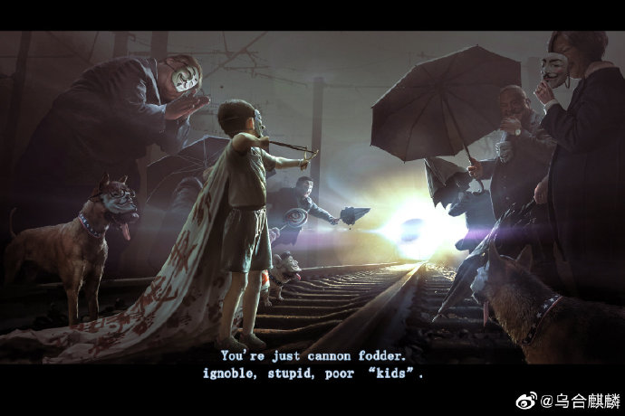 香港動亂,烏合麒麟作畫《炮灰》,描繪頭戴面具,手持彈弓的孩子試圖螳臂當車,一旁的大人則摘下面具露出險惡微笑的畫面,其中對暴徒的揶揄也不難體味。