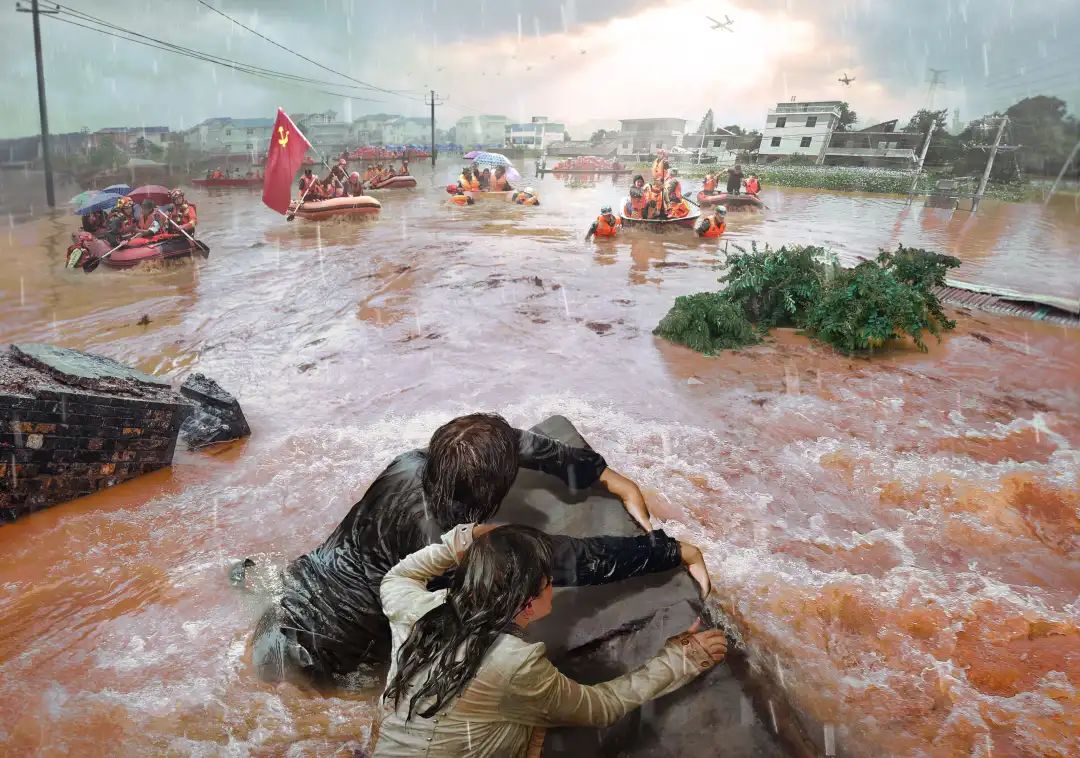 河南洪災牽動14億中國民眾的心時,烏合麒麟為河南的風雨畫了一張圖《同舟》。