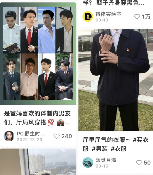 其實在秀才打入年輕人內部之前,年輕羣體曾經追捧過一段時間的廳局風穿搭。襯衫配西褲,精緻且乾淨,手拿保温杯,假裝體制內。這種穿着正氣、端莊、大氣、沉穩,給人一種可靠感和安全感。