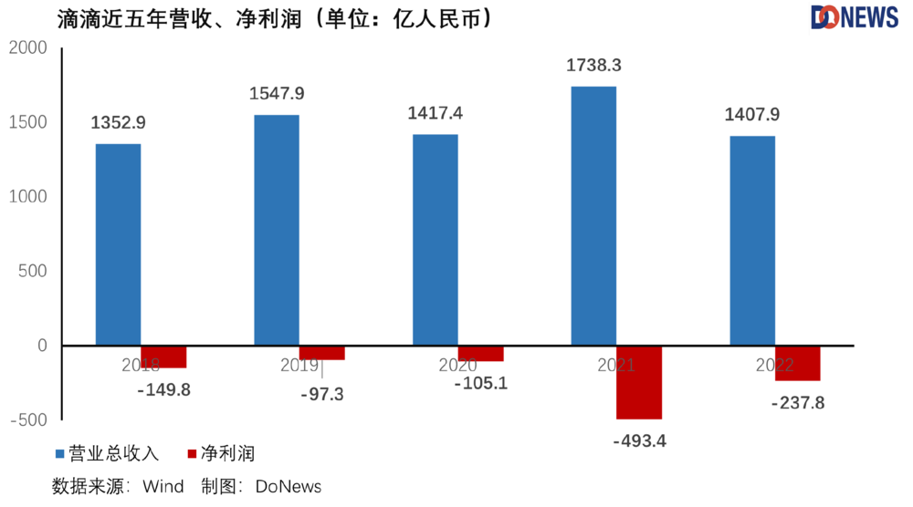 近幾年,出行行業發展有所滯緩,而滴滴作為國內領先的出行公司,很難不受影響。根據其招股書和財報披露的信息顯示,滴滴在2018 年至 2022年,分別虧損了人民幣150億元、97億元、106億元、493億元和238億元。