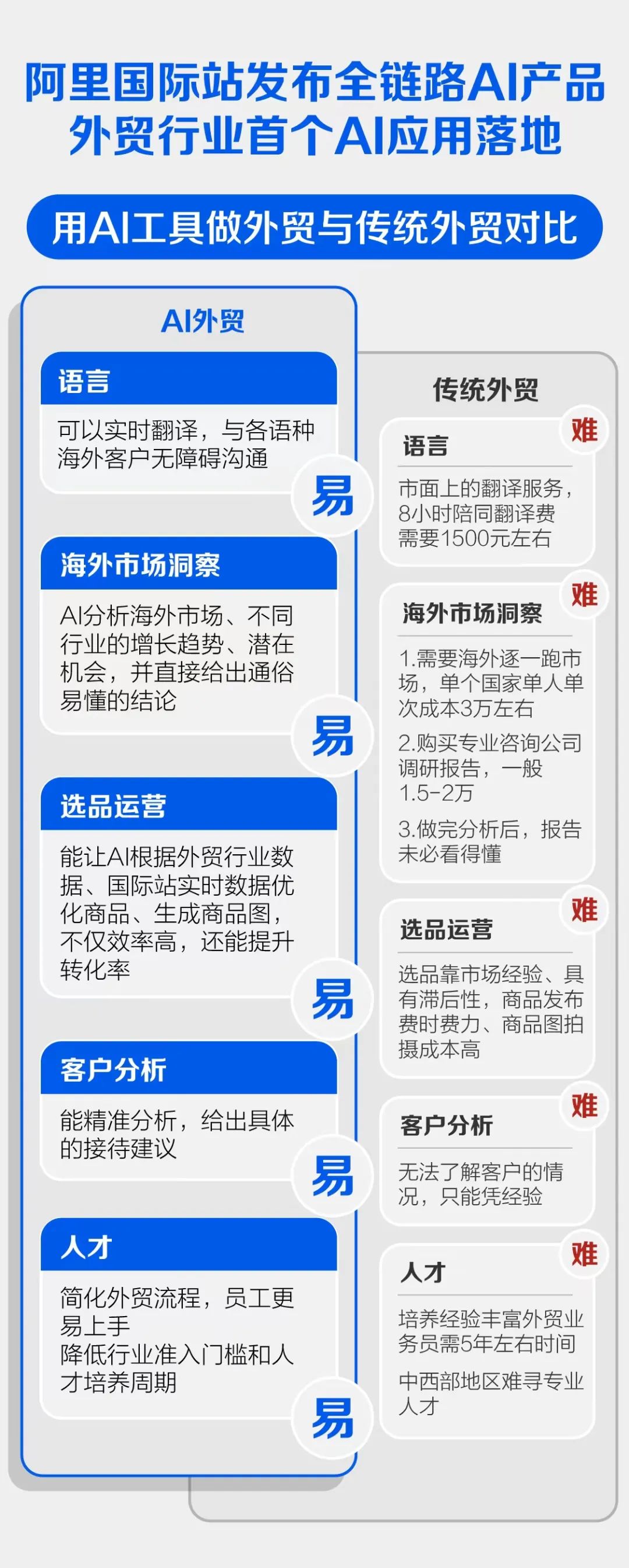 因此,為了切實解決賣家們的痛點,在這方面有着深厚積累的阿里國際站,基於 24 年的外貿經驗和平台數據能力,投餵出了一個真正懂外貿的 AI 助手,並且與阿里國際站的數字外貿全鏈路緊密結合。在 “ 千模大戰 ” 的一片喧囂下,率先跑出了與外貿產業結合的第一個實際應用產品。
