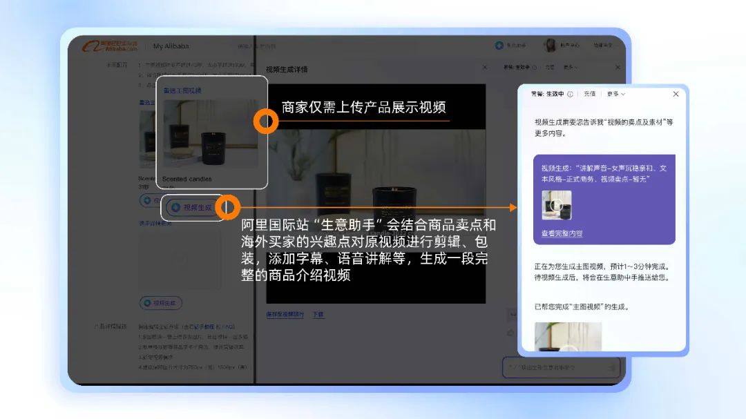 不僅是幾秒鐘處理圖片,甚至商品的介紹視頻也可以交給 “ 生意助手 ”。視頻丟進去之後,就能自動完成從剪輯、背景配樂、人聲解説、字幕製作全套流程。
