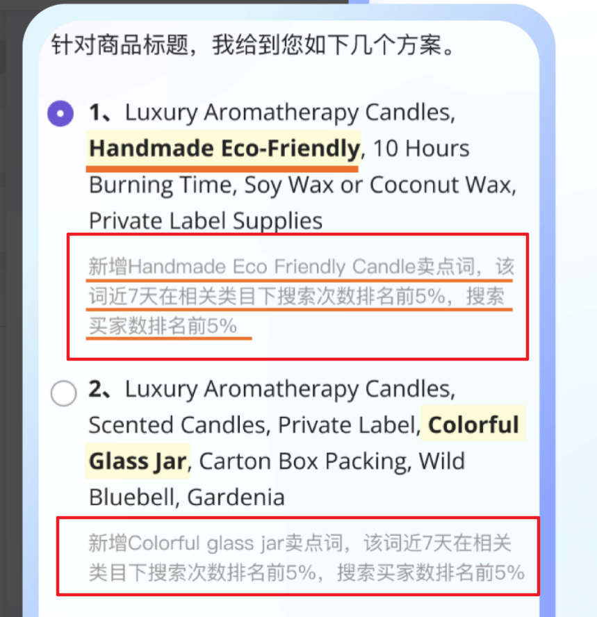 依然拿香薰蠟燭為例,能看到 “ 生意助手 ” 自動提取出了 **“ handmade( 手工 )”、“ Eco-Friendly ( 環保 )”**等幾個海外市場上比較受歡迎的點。並基於捕捉的熱詞,生成了多個標題,供你選擇。