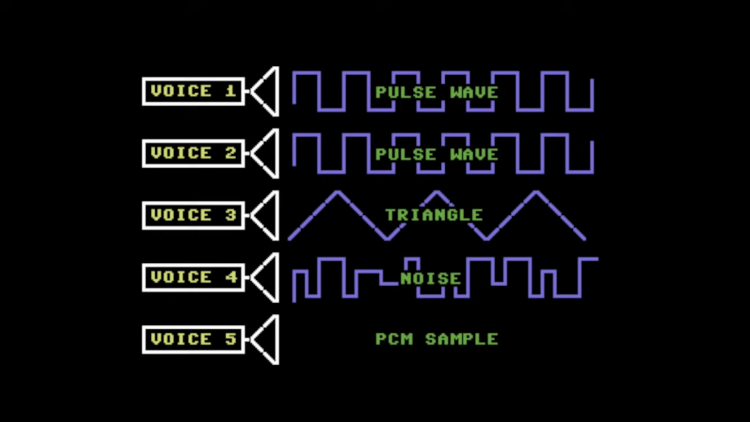 在圖片中,NES 的前兩個音軌只能產生方波。第三個音軌只會產生出像是三角形的波,通常用於低音基調。第四個音軌只能產生噪音波形。第五個音軌是 PCM 採樣現實中樂器的聲音。
