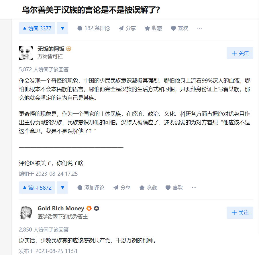 所以,所謂的民族矛盾,像這次很多“大漢族主義”者們抨擊烏爾善言論,其實也是為了維護他們所理解的大漢族羣體榮譽地位。因為他們認為烏爾善冒犯了漢族。
