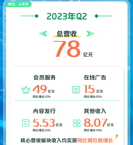 8月22日,愛奇藝發佈了截至6月30日未經審計的第二季度財報,數據顯示,報告期內,愛奇藝總營收78億元人民幣,同比增長17%。非美國通用會計準則(non-GAAP)下,愛奇藝運營利潤為7.86億元,已連續六個季度保持運營盈利。