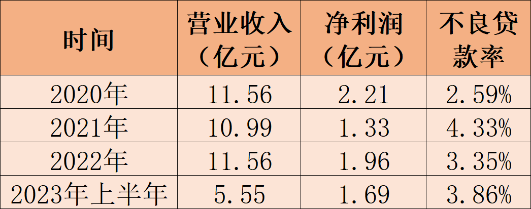 2020-2022年,潁東農商行的營業收入分別為11.56億元、10.99億元和11.56億元,淨利潤分別為2.21億元、1.33億元和1.96億元。