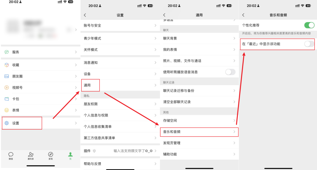 只要在新的設置——通用——音樂和音頻裏面,關掉在「 最近 」中顯示該功能。