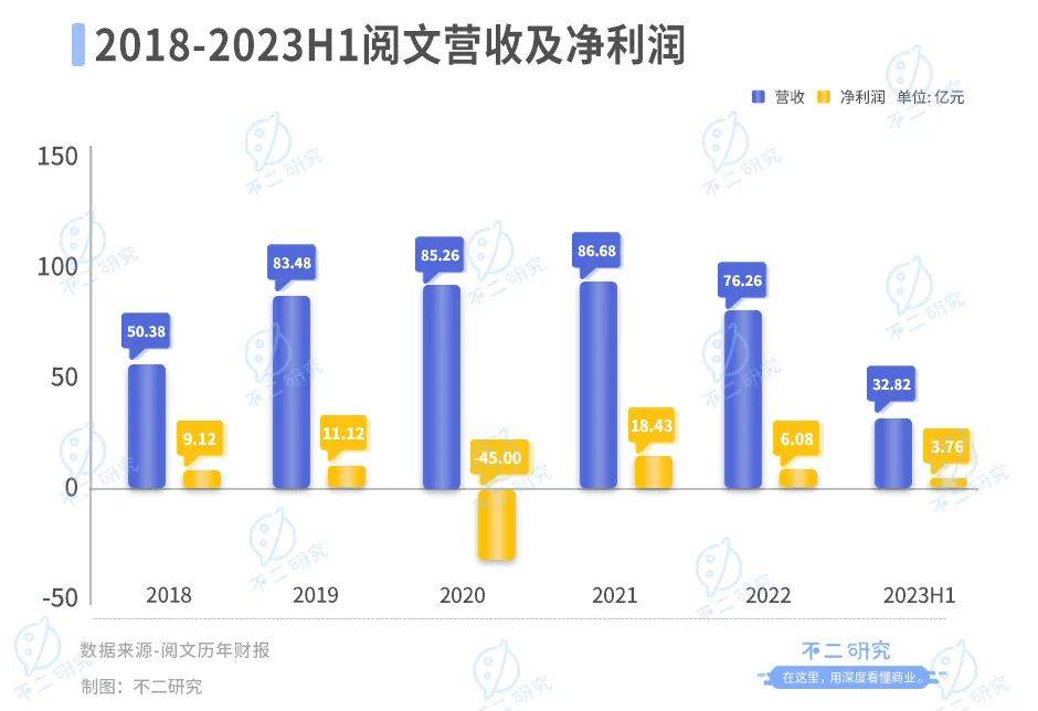 縱觀近5年年報數據,2018年-2022年閲文分別實現收入50.38億元、83.48億元、85.26億元、86.68億元和76.26億元,其中2022年同比下滑12.0%;淨利潤分別為9.12億元、11.12億元、-45.00億元、18.43億元和6.08億元。