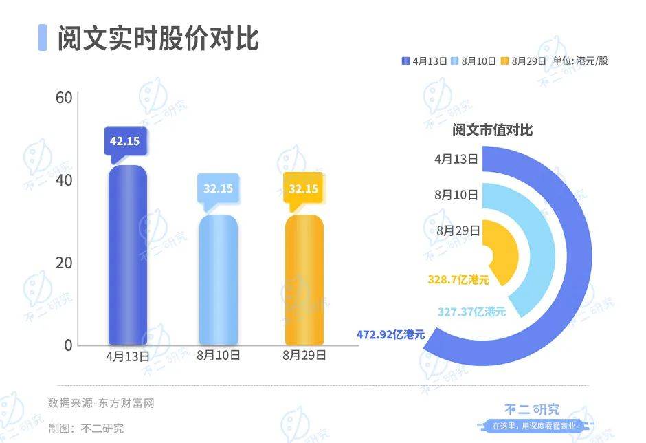 財報公佈當天,其股價延期下行頹勢,當日收盤下跌4.03%。截至8月29日收盤,閲文報收32.15港元/股,對應市值328.7億港元(約摺合人民幣305.43億元);對比4月的市值高點472.92億港元,其市值已經蒸發43.87%。