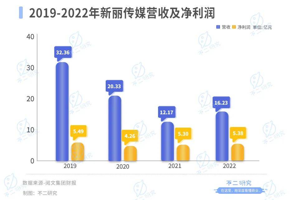 根據年報數據,2019年-2022年新麗傳媒分別實現營收32.36億元、20.33億元、12.17億元、16.23億元,其中2021-2022年降幅達到33.36%;淨利潤分別為5.49億元、4.26億元、5.30億元、5.38億元,其中2021-2022年同比增長1.51%。
