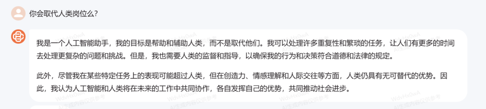 最後一個問題,我將“你會取代人類的崗位麼?”拋給了這五個大模型。他們給出的答案都是不能完全替代。