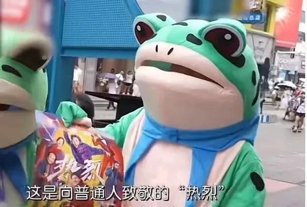 還有大鵬導演,為了宣傳《熱烈》,先是35度的天穿青蛙服上街發海報,又到合肥場“零點蹦迪”,還去了義烏街頭騎共享單車和小瀋陽團隊一起大喇叭搖旗掃街。