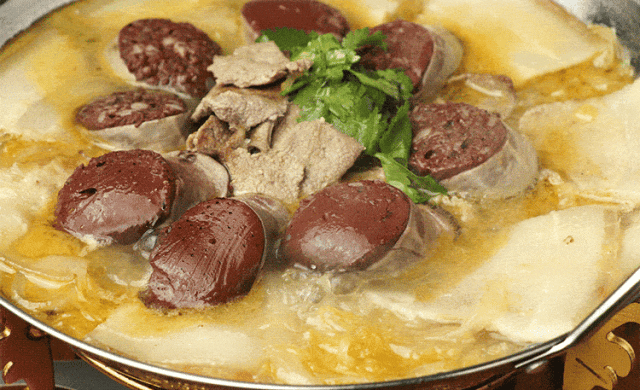 血腸是東北人的傳統食品,宰豬(羊)時,用大盆裝些鹽水接血,然後攪拌血液,使其不凝固,拌上剁碎的豬(羊)油和葱末、鹽、姜粉、胡椒粉等調料後灌腸,紮緊捆實,放入鍋中煮制而成。切片食用,或做酸菜時血腸白肉同時放入,血腸味道濃香,油而不膩。