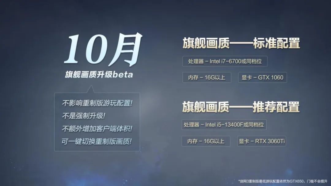 今年10月份,劍網3客户端開放部分旗艦版內容,玩家可以提前在PC端體驗旗艦畫質。明年4月,旗艦版正式上線,屆時PC端將更換全新引擎,與移動端實現數據互通。
