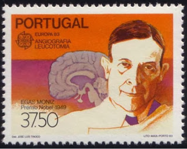 葡萄牙紀念莫尼茲獲得諾貝爾獎的郵票,上面也是莫尼茲照片和一個大腦圖像。