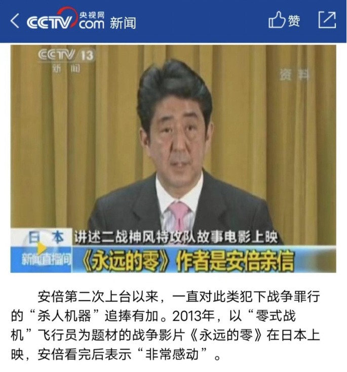 [6]央視網《安倍欲洗白日本侵略史 追捧二戰殺人魔“零式戰機”》2017年6月12日