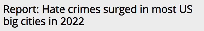分析顯示,在2022年美國主要城市報告的仇恨犯罪中,超過20%犯罪事件的加害目標是黑人,是所有羣體中佔比最高的。並且,在調查涉及的42個城市中,半數以上城市的反黑人仇恨犯罪有所增加,一些城市甚至達到了歷史最高水平。紐約市、洛杉磯、奧斯汀、薩克拉門託都創下了近現代時期的紀錄。