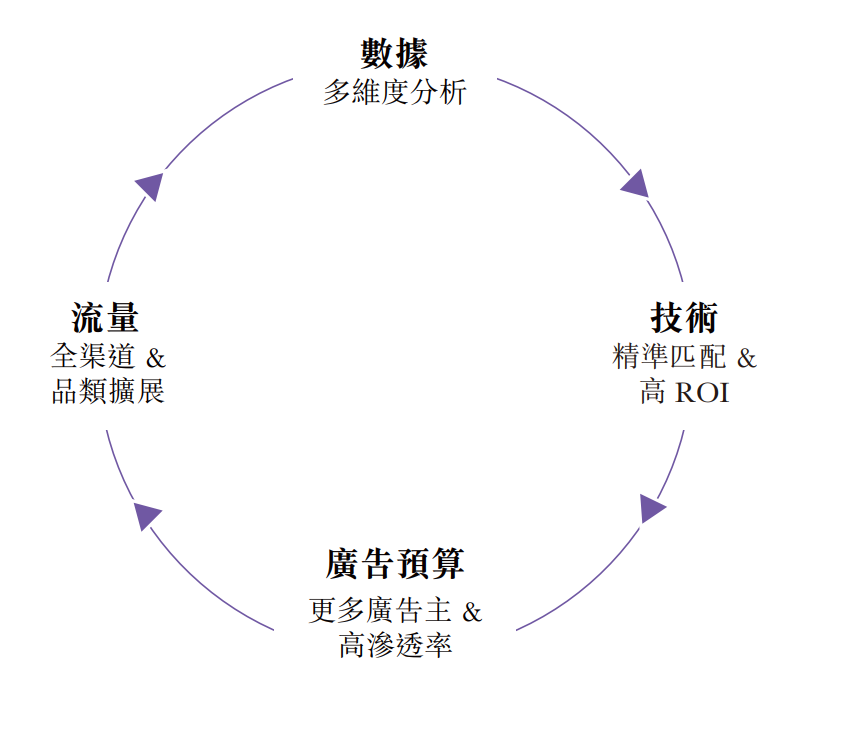 比如在今年5月,Mintegral上線了Target ROAS(廣告支出回報率)智能出價功能,當廣告主開啓全渠道數據回傳後,Mintegral可以根據應用內交互數據進行機器學習,吃透投放效果,實時預估用户 LTV 價值,並在此基礎上根據廣告主設定的ROAS目標實時出價,不斷自動優化投放方案。而這也體現了Mintegral的飛輪效應,技術優勢吸引而來的廣告主,貢獻更多流量與數據,並反哺技術的發展,從而提高商業化價值。