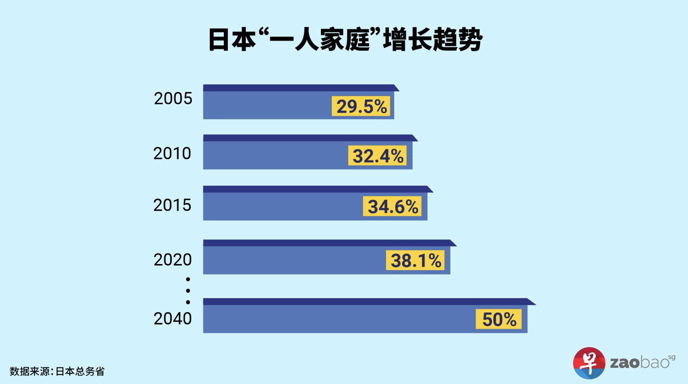 日本現在單人家庭已近40%,預計到2040年達到50%。