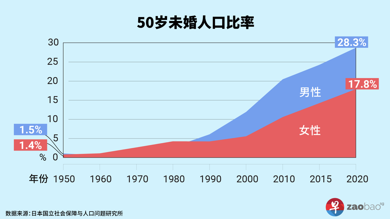 2020年,日本50歲未婚人口比例已經很高,男的達到28.3%,女的達到17.8%。這些是從來未結婚的人口,並非有過婚史但獨居的人口。有意思的是,從80年代中開始,男性未婚比例持續超過女性,如今已經有較大的差距。換句話説,女性中有一部分初婚嫁給再婚的男性,才造成這樣的差異。反之,男性初婚取再婚的女性可能較少。也就是説,再婚男人與剩女的結合較多,再婚女人與剩男的結合較少,女人“剩”了還有“脱剩”的希望,男人“剩”了就一剩到底了。