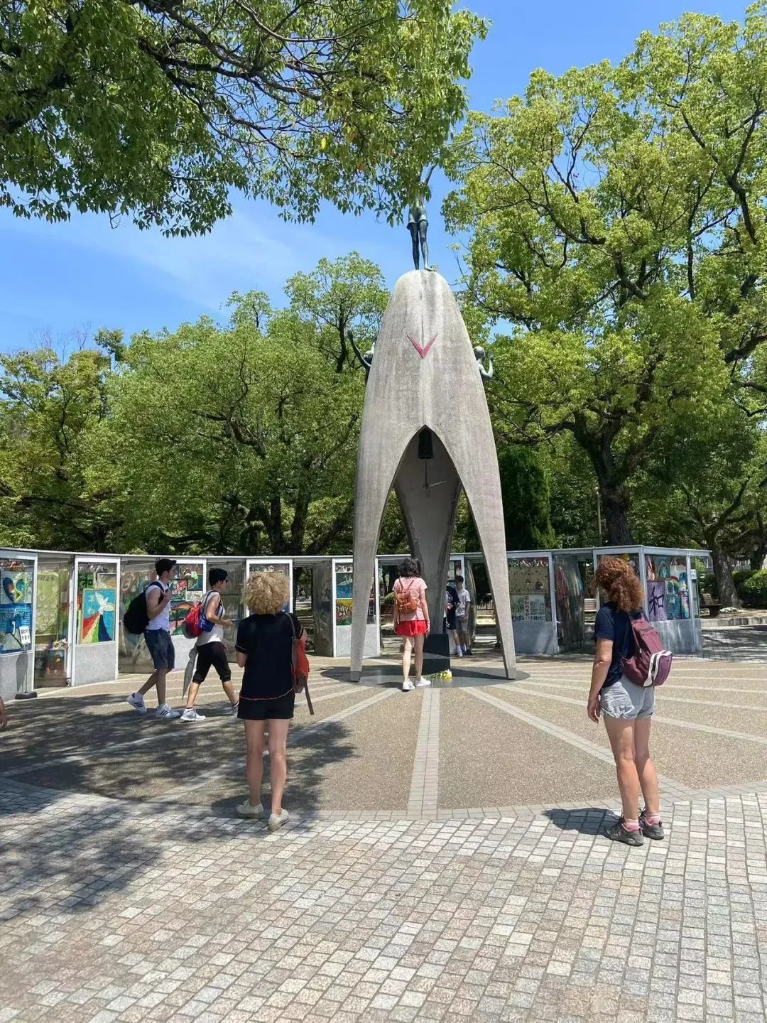 廣島和平公園紀念館(即“原爆紀念館”)是肅穆的。漆黑漫長的甬道之間,設計者嘗試複製出核爆當天的壓抑與恐怖,長廊之間受害者的照片與遺物——校服上的肩章、被高温熔化的鋁飯盒、殘破的課本……1945年的8月5日本應是平平常常的一天,儘管戰爭的陰霾已經滲入到了生活的邊角,每個人都已經習慣了夜晚不再寧靜,防空警報成為熟悉的聲音,習慣了每天配給變得少的可憐。但是某種程度上,活着就意味着明天,也許他們並不懂得絕對國防圈、ABCD包圍圈。