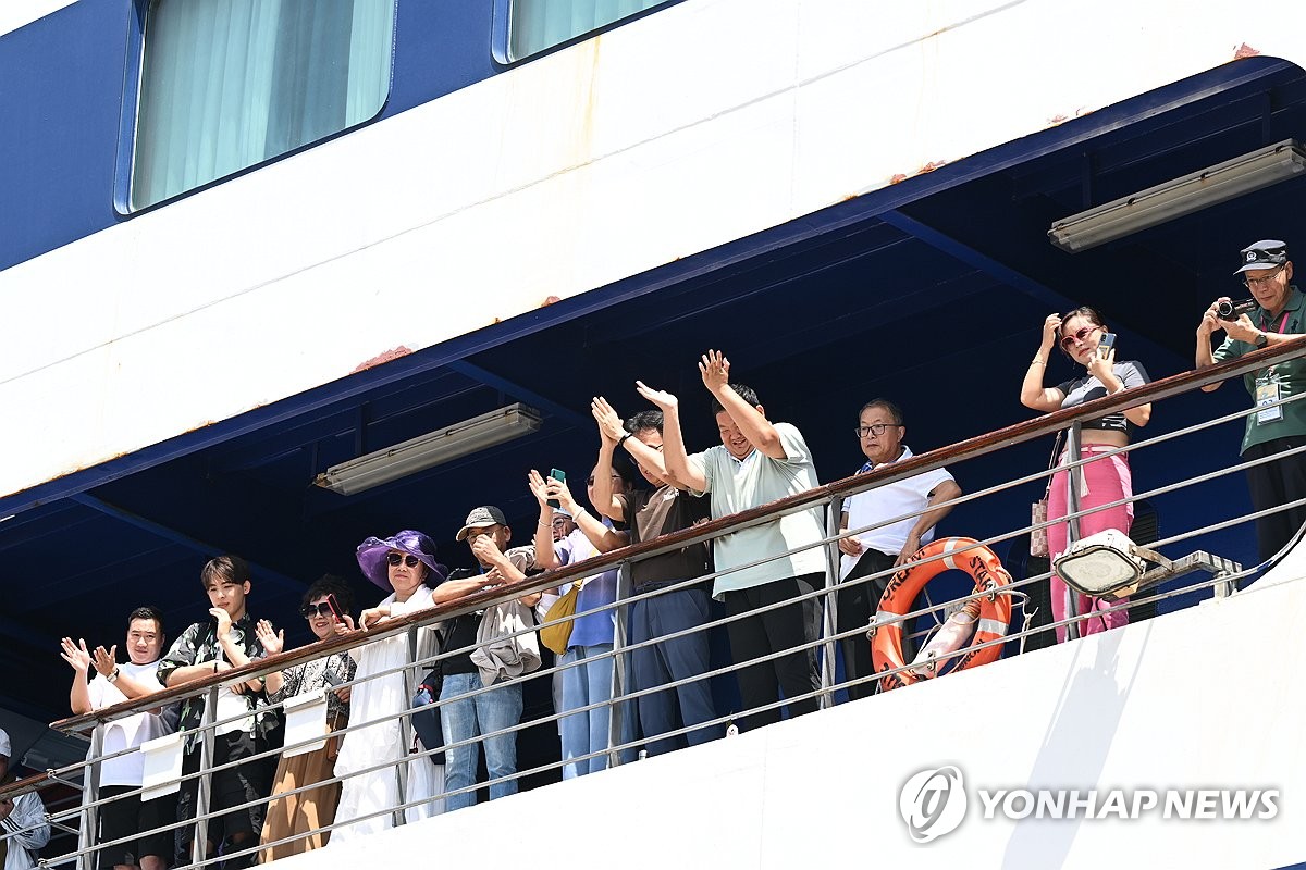 資料圖片:8月31日,在濟州港,自上海出發的“藍夢之星”號郵輪(噸位2.4782萬噸,載客量1275人)靠港停泊。圖為船上中國團體遊客揮手致意。 韓聯社/濟州道攝影記者會
