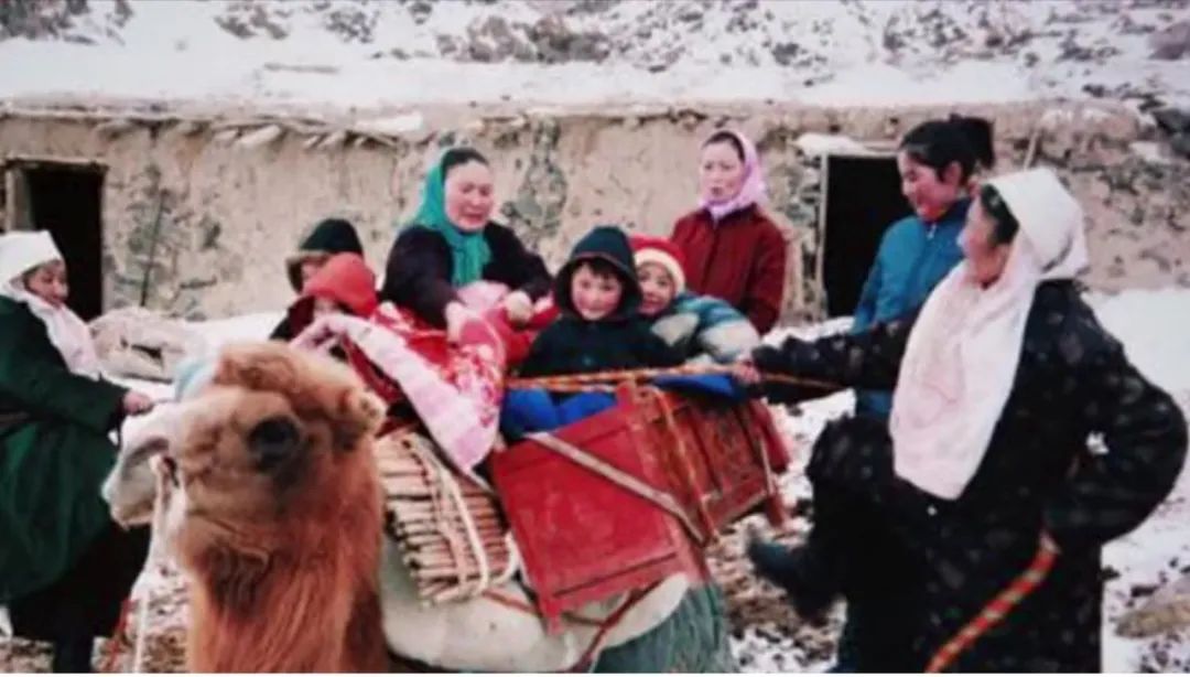 ▲轉場的隊伍,女人懷裏抱着孩子,手上牽着駱駝,男人則趕着牛羊