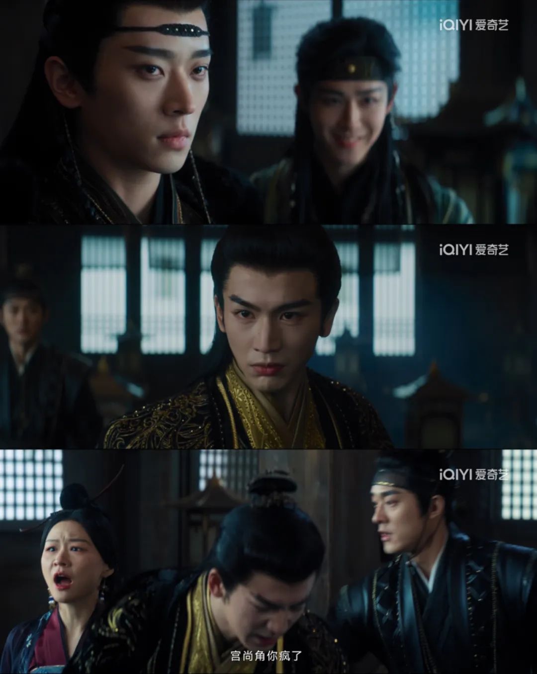 更讓人回味悠長的是,宮子羽和宮尚角一個哥控一個弟控,外加是家族死對頭,真是非常郭敬明,耽美味兒令人不自覺嘴角泛起邪笑。前面宮尚角給宮遠徵的一巴掌,想必把他打得很爽。你看,《雲之羽》有自己的高啓盛!