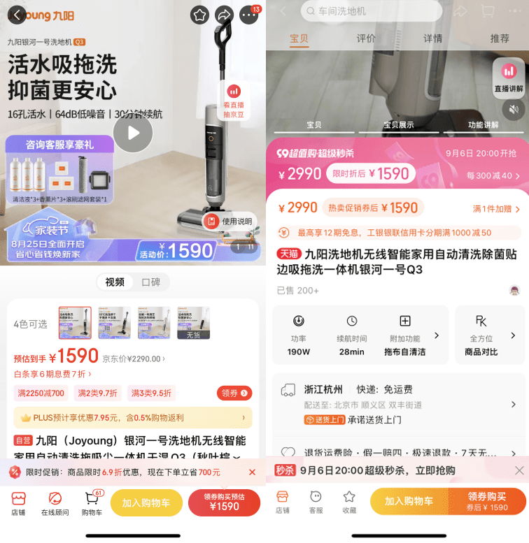 9月6日,「界面新聞·子彈財經」在京東、天貓的九陽官方旗艦店查詢發現,這款洗地機券後價均為1590元,在天貓上銷售顯示“已售200+”。