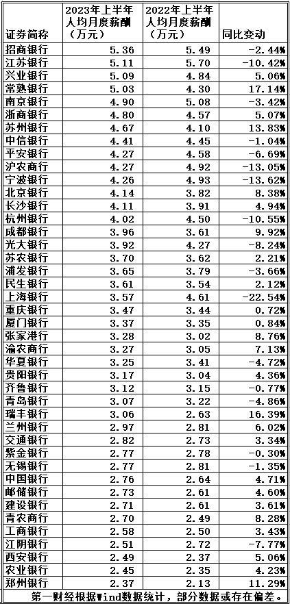 總體來看,42家上市銀行人均半年薪酬約為18.59萬元,相當於人均月薪3.1萬元,幾乎與去年同期持平。