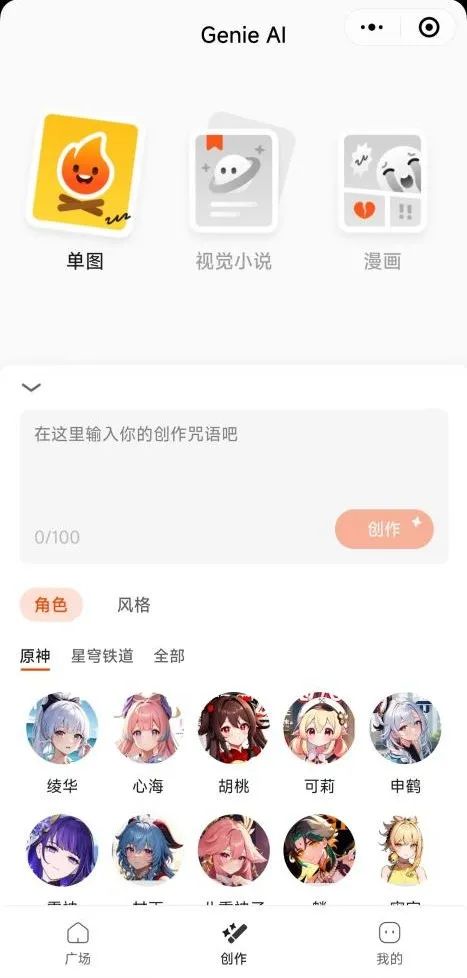 二次元同人創作社區“Genie AI”,對於文心一言的應用則有所不同。產品負責人告訴陸玖商業評論,目前Genie AI所涉及的“原神、星穹鐵道”相關的同人創作,主要是基於其中的人氣角色,進行對應單圖、視覺小説、和漫畫的相關二創。