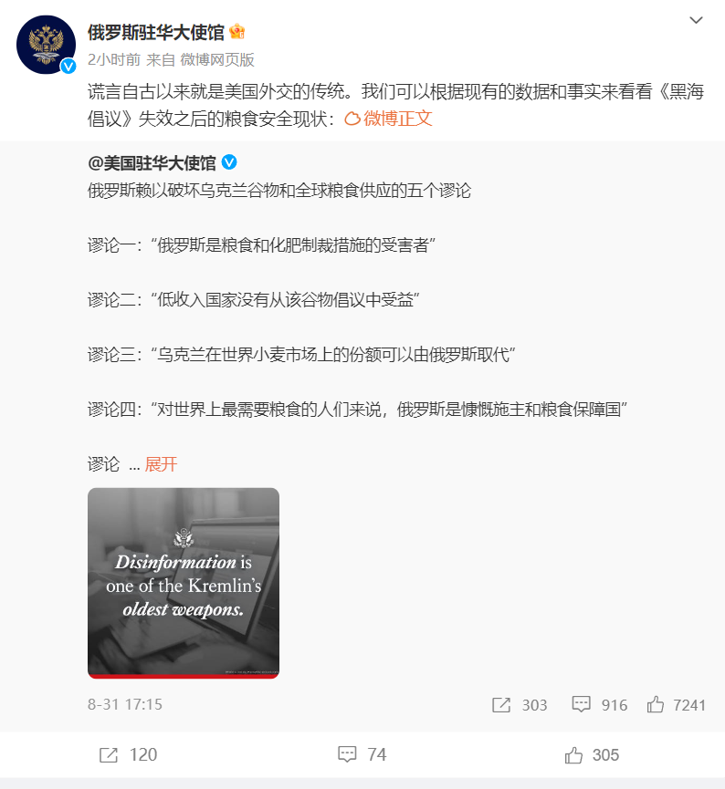【謊言自古以來就是美國外交的傳統】8月31日,美國使館發表了“俄羅斯賴以破壞烏克蘭穀物和全球糧食供應的五個謬論”的微博。我們可以根據現有的數據和事實來看看《黑海谷物倡議》失效之後的糧食安全現狀。