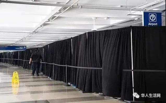 隨後市長決定將這 433 名非法移民送到機場尋求庇護,機場則用黑色窗簾來擋住了這一幕。