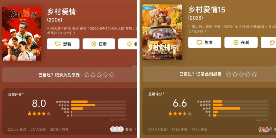 作品質量也開始下降,《鄉村愛情》最早的評分為8.0,但最近幾季都未上過7分。