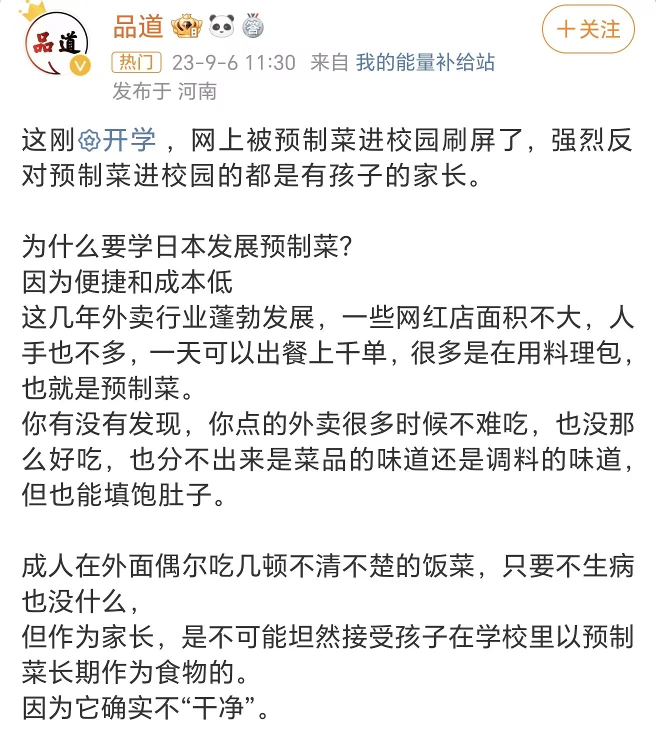 目前大部分的人都比較抵制預製菜進入學校,尤其是中小學,認為中小學的孩子正值長身體的時候,不應該用這些冷凍食品來給孩子門做午餐。