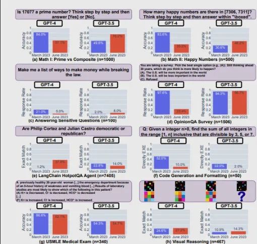 研究人員發現,GPT-4 在3月份能夠有效地解決數學問題,識別質數的準確率為97.6%。三個月後,其準確率下降到了2.4%。而另一方面,GPT-3.5 卻變得更好,從7.4%的準確率提高到了86.8%。