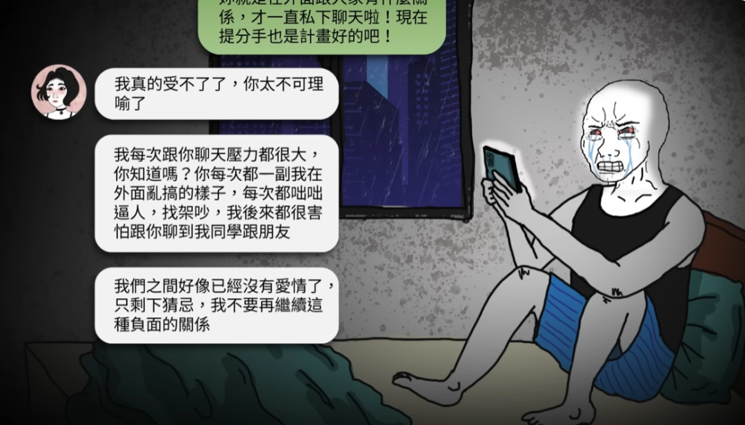 在感情方面上,男主對第二任女友身邊的男性抱有高度的戒備心理,甚至多次懷疑女友出軌不忠。