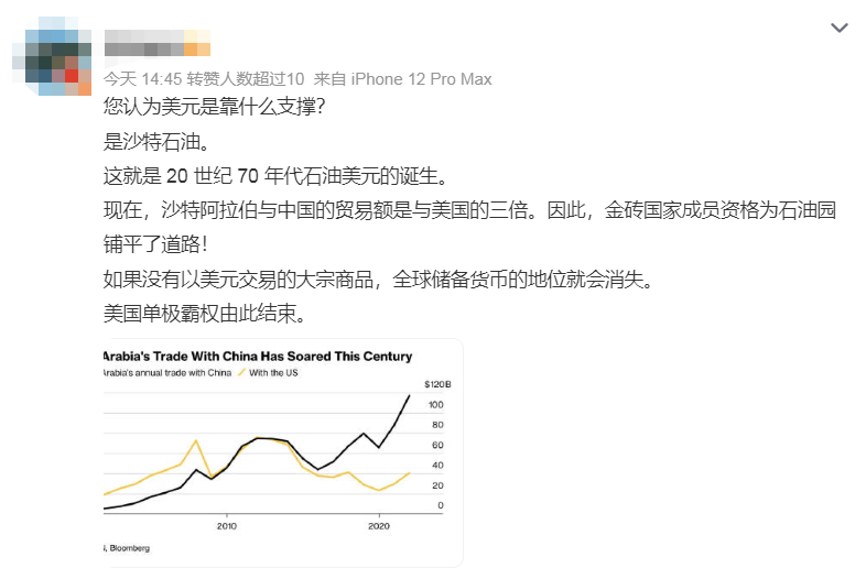 美歐從烏克蘭運糧到發達國家餵豬,俄羅斯向埃及等發展中人口大國供糧;美國撕毀伊核協議、貶低沙特是“賤民國家”,中國卻能促進沙特伊朗和平談判。所以當這些中東國家出現在金磚新成員名單上,歐美又何必才想起來哀嘆“石油美元藥丸”?