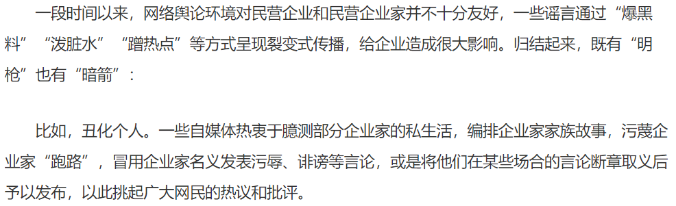 **這是一次再明顯不過的反串黑公關:**國內所有媒體專家一擁而上,民營企業的功績如數家珍、民營企業的不容易哭天抹淚,境外媒體更是吐出了很多摻雜意識形態抹黑的髒水,內外聯動彷彿民營企業馬上就要被卸磨殺驢了。直到現在,上至最高領導人的官方都要不斷出面否定“離場論”,並接連出台讓利政策安撫民營企業自證清白,反串黑策略大成功。