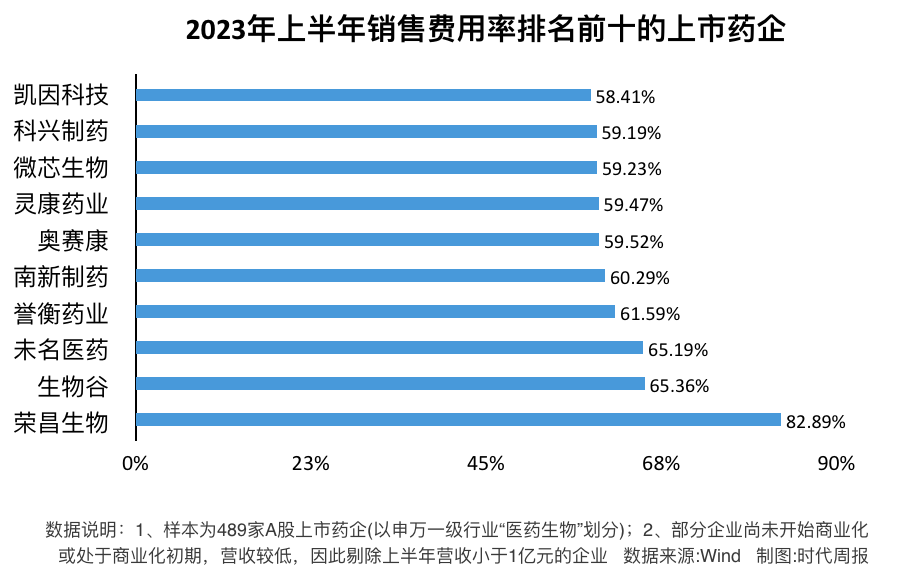 剔除後,A股藥企中上半年銷售費用率最高的為來自科創板的榮昌生物(688331.SH),上半年該公司營收4.22億元,銷售費用為3.5億元,銷售費用率達82.9%。