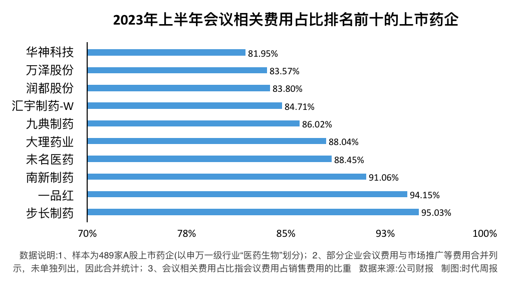而部分藥企的銷售費用中,會議相關費用已然成為大頭。149家列出會議相關費用的藥企中,19家學術會議相關費用佔銷售費用比重超50%。其中步長製藥、一品紅(300727.SZ)、南新制藥(688189.SH)、未名醫藥、大理藥業(603963.SH)等企業佔比較高。