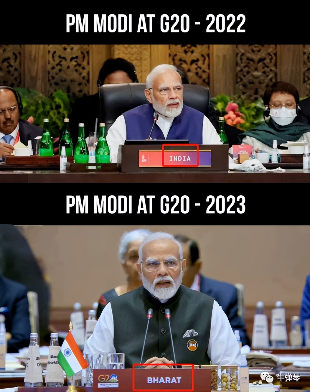 很多人突然注意到,去年印尼主辦G20峯會,印度總理莫迪前面的桌牌,還明確寫着INDIA(印度);但今年印度是東道主,莫迪前面的桌牌已經變成了BHARAT(巴拉特,即婆羅多)。