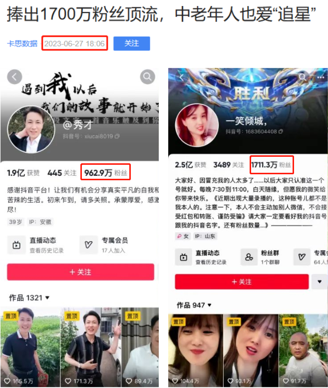 首先,在6月底7月初的時候,秀才和一笑傾城被綁定成中老年羣體最喜愛的網紅,而被介紹。