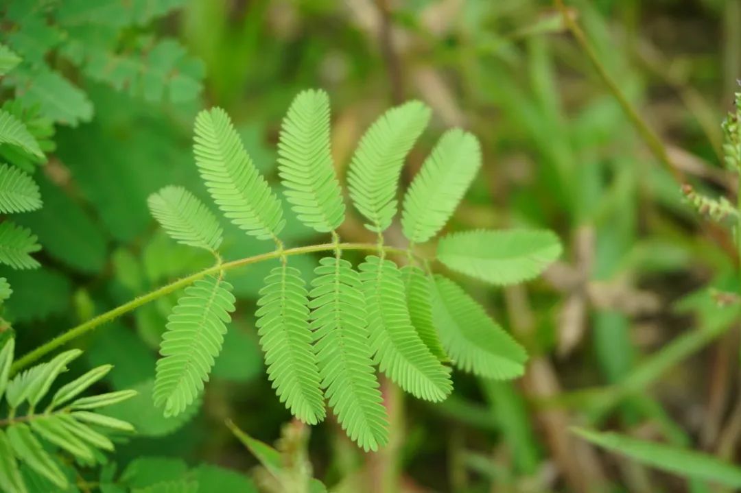 **當我們觸碰到含羞草的葉子時,由於受到外界的刺激,它們的葉柄會下垂,進而合併上葉子。**過了一段時間後,它們的葉子又會自己打開,恢復原狀。