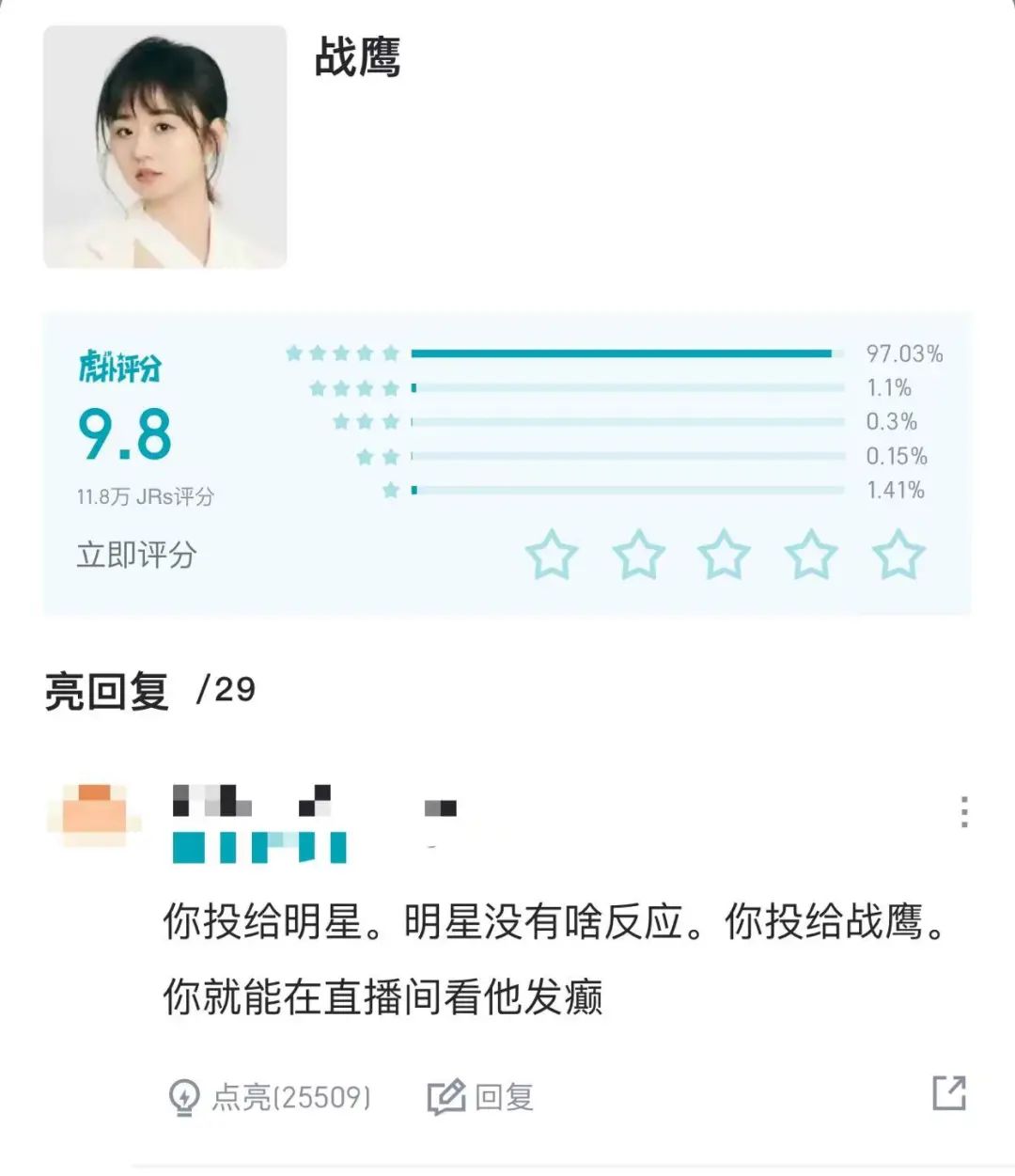 作為主播,戰鷹的粉絲粘性強得不是一點半點,就算粉絲規模不及諸多娛樂圈明星,但打投能帶來更多的成就感。誠如在戰鷹虎撲評分頁面最高亮的評論所言,“你投給明星,明星沒啥反應,你投給戰鷹,你就能在直播間看她發癲。”