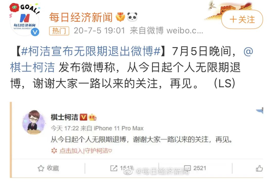 2017年代表人類圍棋最強戰力大戰阿爾法狗,讓不看圍棋的人也關注到了他。後來柯潔也一直在微博十分活躍,直到2020年突然宣佈無限期退出微博,退回到B站這一舒適區。